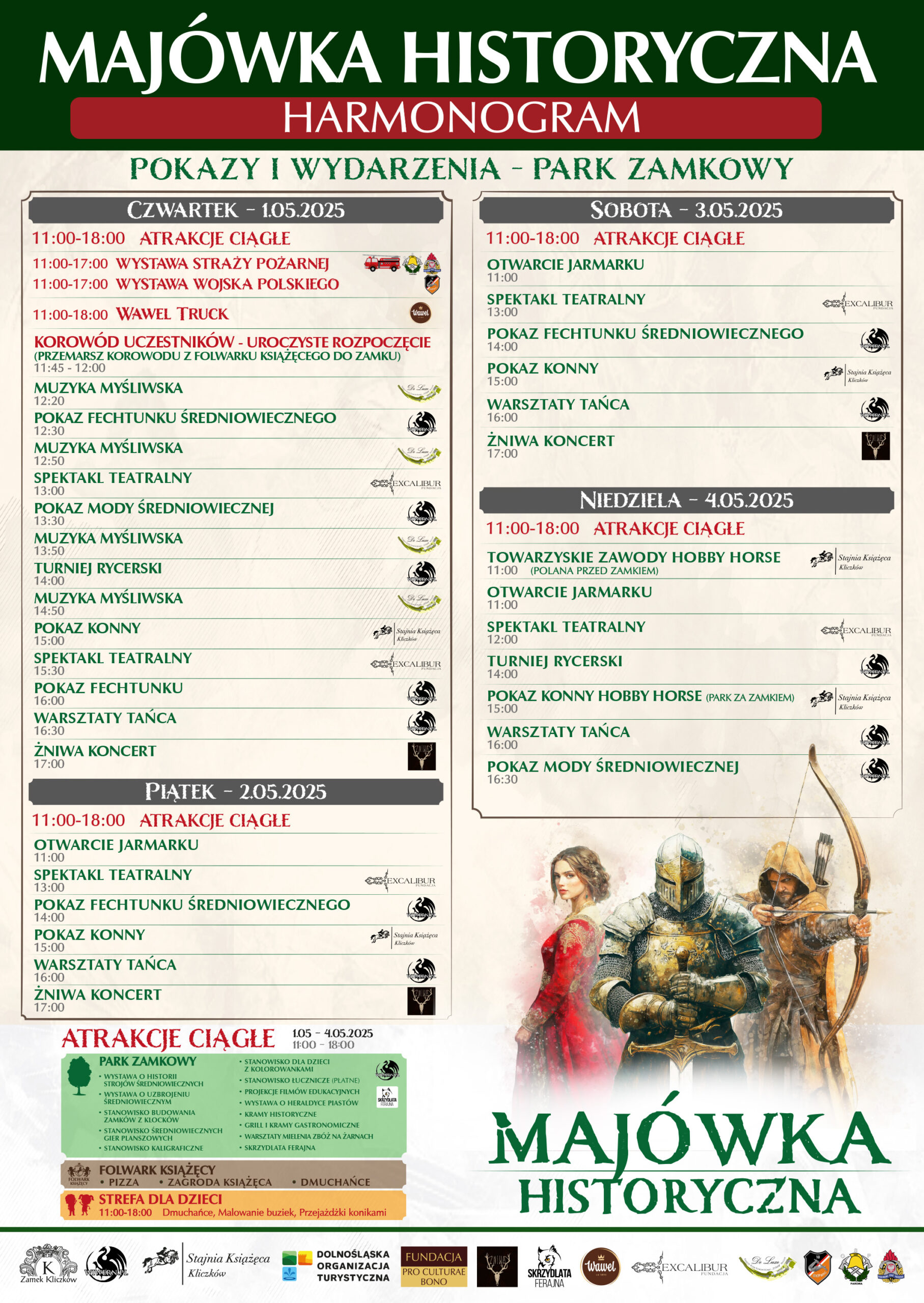 W czasie trwania Majówki Historycznej odbędzie się festyn grillowy oraz zostanie stworzona strefa dla dzieci. Moc radości dzieciom zapewni Wawel Truck pełen słodyczy i dobrej zabawy. Zapraszamy Państwa wraz z pociechami do Zamku Kliczków na majówkę z dziećmi. Tylko u nas jak za dotknięciem czarodziejskiej różdżki przeniesiecie się w czasie o kilka stuleci wstecz i będziecie mogli doświadczyć historii Polski w jeden dzień. To będzie widowisko! Nie może Was zabraknąć!