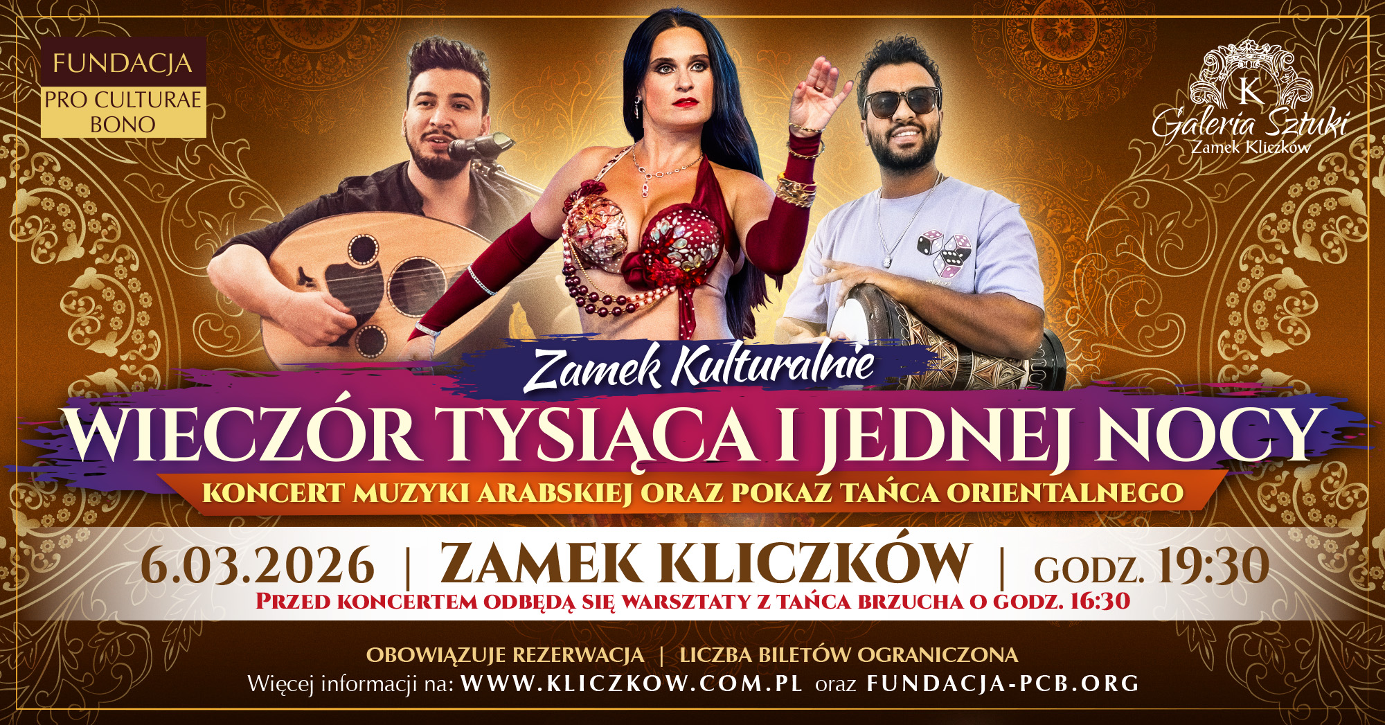 Zamek Kliczków oraz Fundacja Pro Culturae Bono serdecznie zapraszają na koncert muzyki arabskiej oraz pokaz tańca orientalnego, który odbędzie się 6 marca 2026 roku o godzinie 19.30 w Sali Teatralnej. Przed koncertem odbędą się warsztaty z tańca brzucha o 16:30.